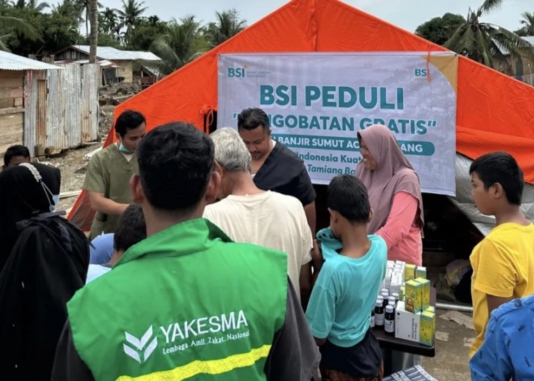 Aceh Tamiang — LAZNAS YAKESMA Cabang Sumatera Utara (Sumut) berkolaborasi dengan BSI Maslahat membuka posko pengobatan gratis bagi warga terdampak banjir bandang dan longsor di Desa Kebun Sementok dan Desa Menang Gini, Kecamatan Karang Baru, Kabupaten Aceh Tamiang, Provinsi Aceh, Kamis (18/12/2025).